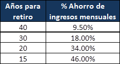 En mi artículo “Cuánto debo ahorrar para lograr la independencia financiera” presenté los porcentajes de ahorro mensual estimados que requeriríamos para lograr la independencia financiera en cierta cantidad de años. A continuación, nuevamente la tabla que resume esta información:
