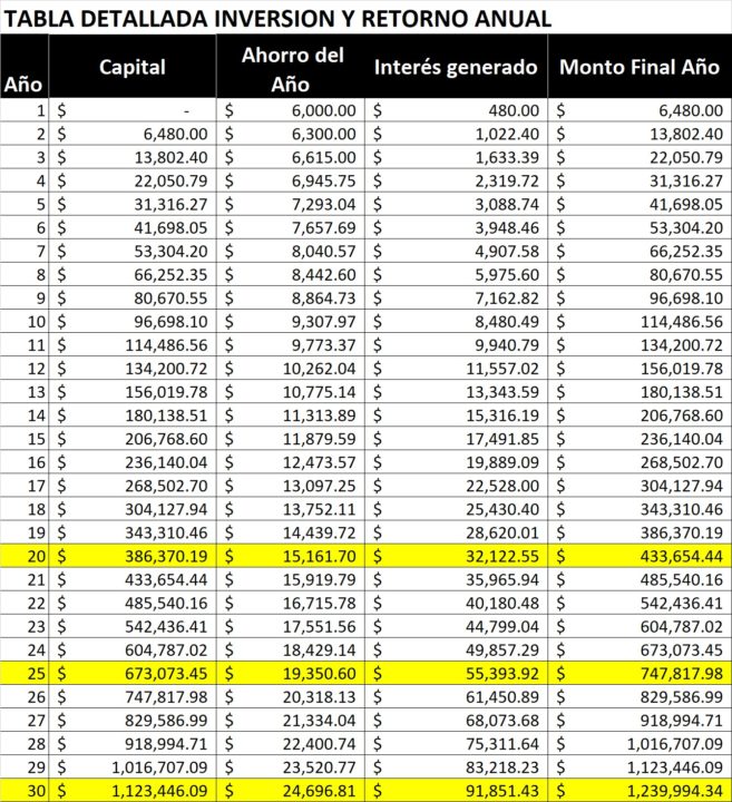 Puede verse que al cabo de 20 años Pedro con 47 años y Analía con 45, habrían acumulado US$433,654.44. Para 25 años, donde Pedro tendría 52 años y Analía 50, habrían acumulado US$747,817.98 y para 30 años de este esquema habrían alcanzado la sorprendente suma de US$1,239,994.34.