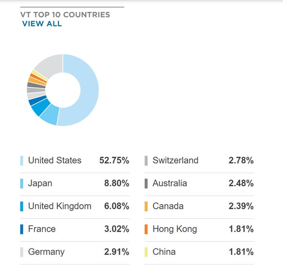 Como puede ver en los datos anteriores, al comprar una acción de VT, usted tiene exposición al mercado global con 7,279 compañías, en 47 países, a un costo de solo 0.14% de su inversión (Esto es US$0.14 centavos por cada US$100.00).