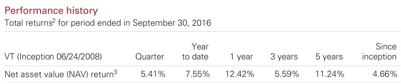 Al momento de escribir este artículo VT cerró el martes 29 de Noviembre de 2016 a un precio de solo US$60.45 la acción, e incluso muchos corredores de bolsa de EEUU no cobran comisión de compra o venta para este ETF. (Con algunas restricciones que debe consultar con cada corredor).