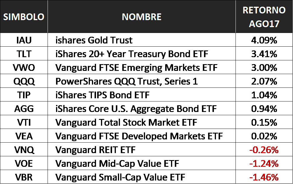 Puede verse que el Oro obtuvo un rendimiento de 4.09%, seguido de los bonos del tesoro de EEUU a largo plazo con un 3.41% y los mercados emergentes con un sorprendente 3%. Estos fueron los que aportaron más para lograr en balance el 0.7% logrado por el portafolio en total para este mes.
