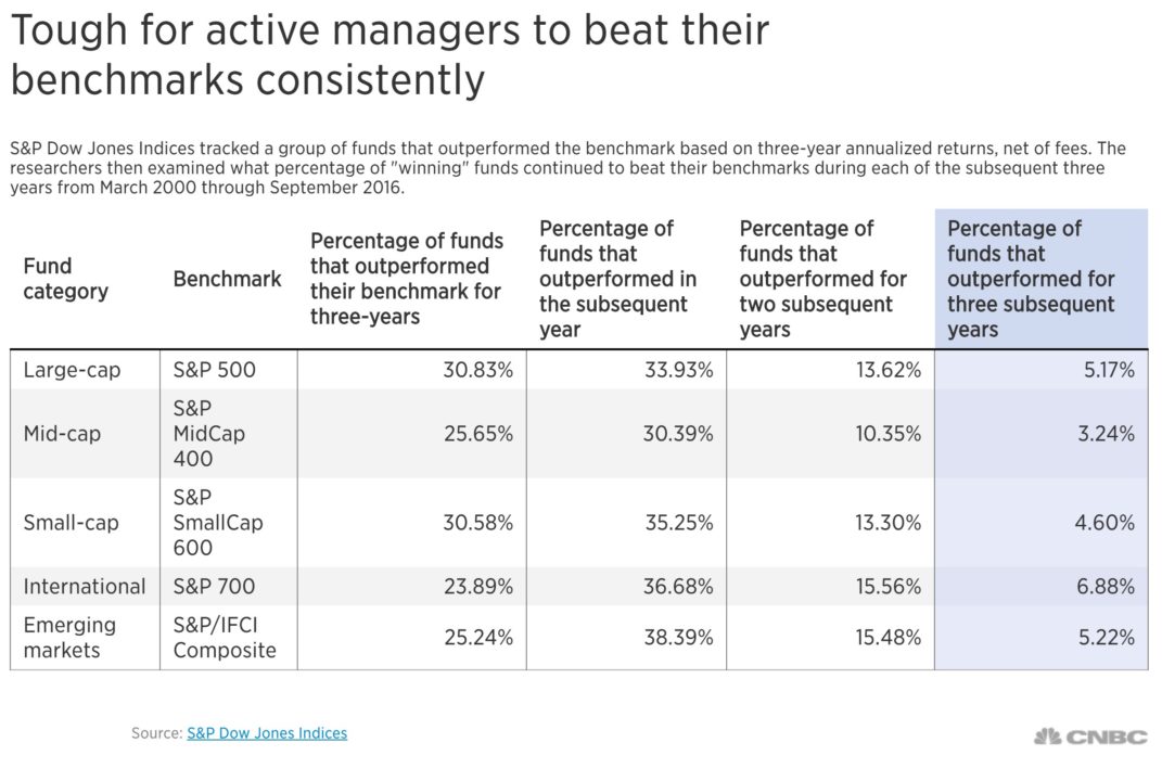 - En EEUU existen unos 10mil Fondos (Según esta página de Statista.com). Determinar cuáles lograrán mayores rendimientos de forma consistente es casi imposible. La estadística histórica así nos lo demuestra, como puede verse en la siguiente gráfica tomada del artículo Active Fund Managers Rarely Beat Their Benchmark Year After Year