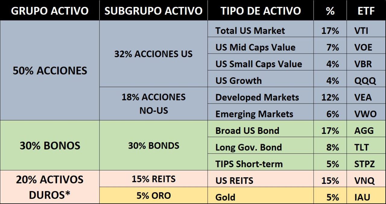 Como ejemplo de un portafolio global presento en este artículo mi portafolio base, la distribución y porcentajes de los diferentes activos del mismo e incluso los productos que he seleccionado como vehículo de inversión para cada tipo de activo.